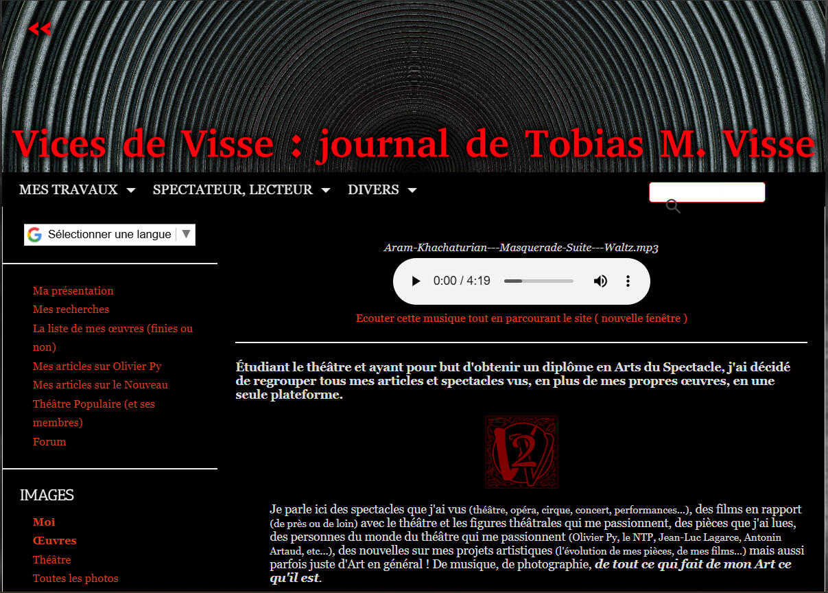 Je m'appelle Tobias Maxime Visse et je suis un étudiant caennais en arts du spectacle, me dirigeant vers des études de mise en scène afin de devenir auteur, metteur en scène et comédien. Je pratique aussi le cabaret / maquillage, à travers mon personnage de Charlotte Opsy, ainsi que la musique (chant, guitare). J'aimerais apprendre l'accordéon et le chant lyrique.Je suis passionné par le travail d'Olivier Py, de Samuel Beckett, du Nouveau Théâtre Populaire et du Zerep, ainsi que du peintre Francis Bacon.J'écris de la poésie depuis mes cinq ans, et j'ai un recueil édité à mon actif (Au Prix de mon malheur, janvier 2024). Aujourd'hui, j'écris majoritairement des textes de théâtre. Ce que je préfère dans l'écriture, c'est le fait de développer des personnages !